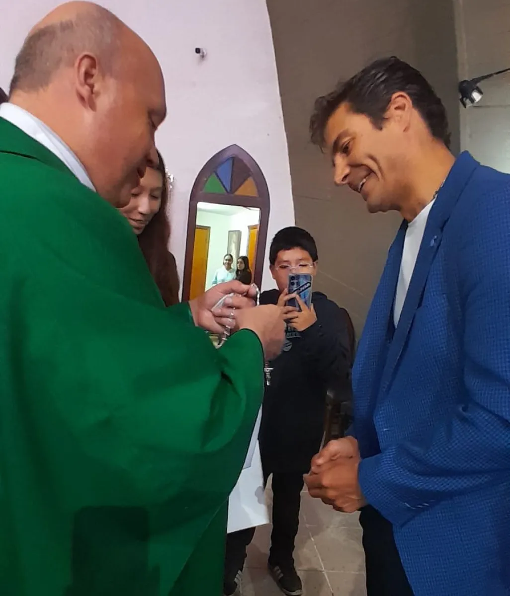 El sacerdote de la iglesia de San Miguel entrega un rosario a Alex. Foto: Andrea Azcui