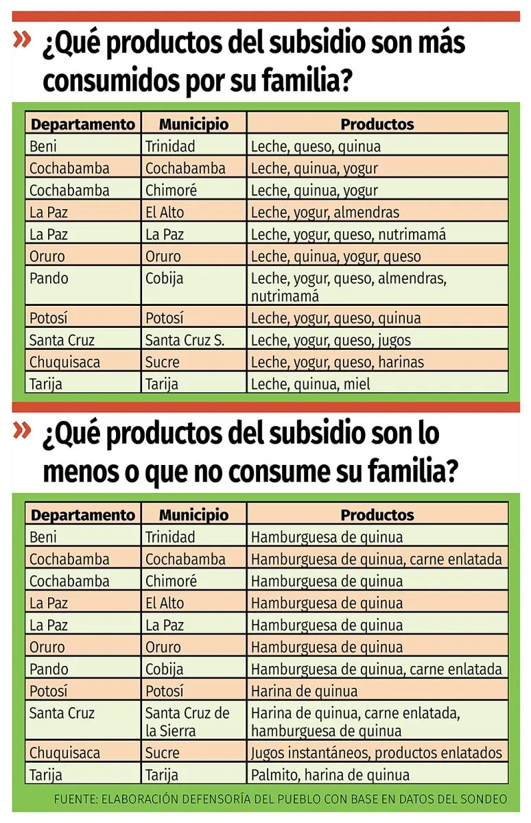 Además, se recomienda al Sedem reponer los productos del subsidio prenatal y lactancia que han merecido disminución en la cantidad otorgada, concretamente la leche en polvo (de tres latas a dos) en los departamentos de La Paz (El Alto), Oruro, Potosí, Santa Cruz y Chuquisaca (Sucre); así como el yogur, quinua en grano y almendra, productos que son los más consumidos por las familias.