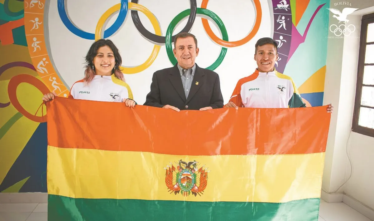 Arze (centro) junto a Maya Quinteros (izq.) y David Ninavia, los abanderados de Bolivia para los Juegos Panamericanos Junior. Foto: COB