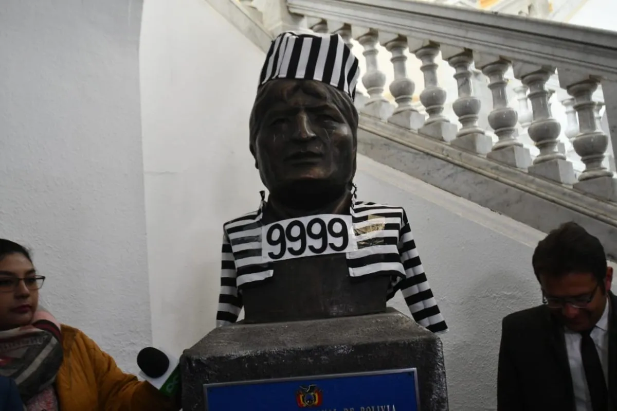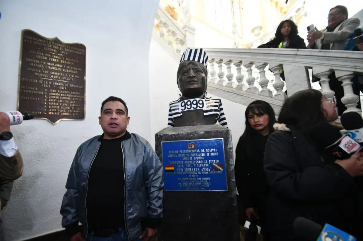 Diputado viste de reo al busto de Evo en la ALP: "Este es el uniforme que utilizará el resto de su vida"