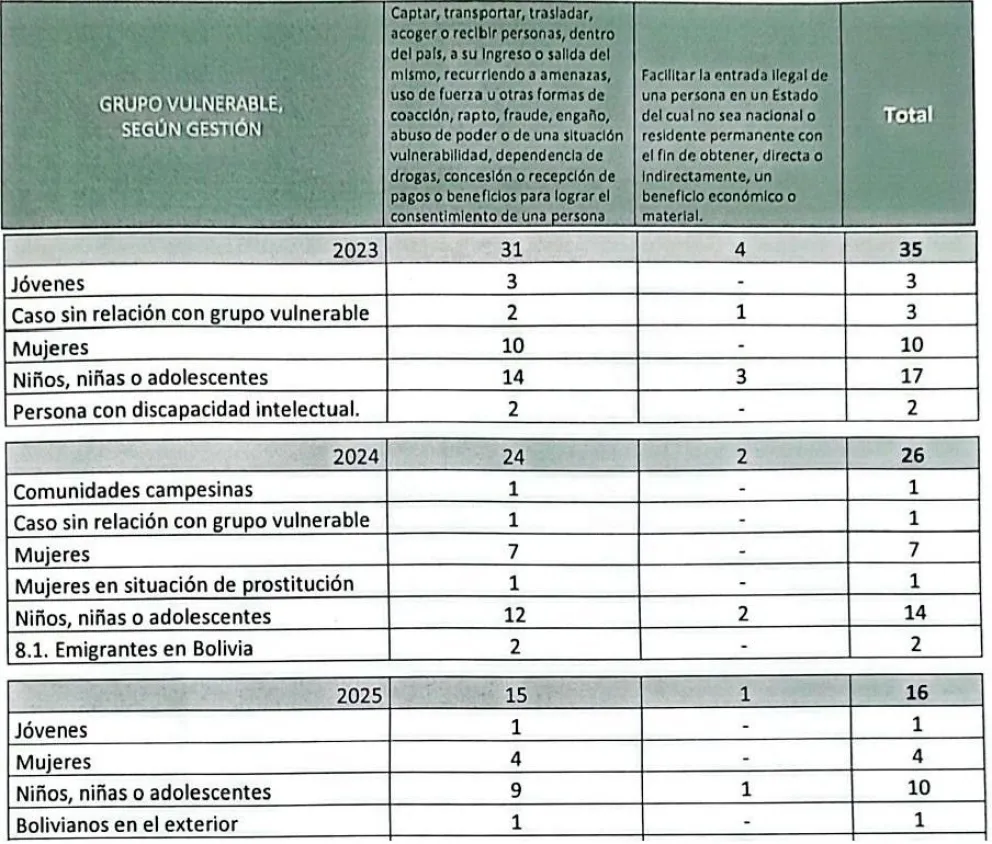 Esa reacción revela una problemática que sigue sin resolverse en Bolivia: la falta de una normativa clara para diferenciar los casos de personas desaparecidas. No todas las desapariciones están vinculadas a trata; algunas encubren otros delitos, como feminicidios. Sin embargo, hoy se tratan con los mismos recursos y respuestas mecánicas.