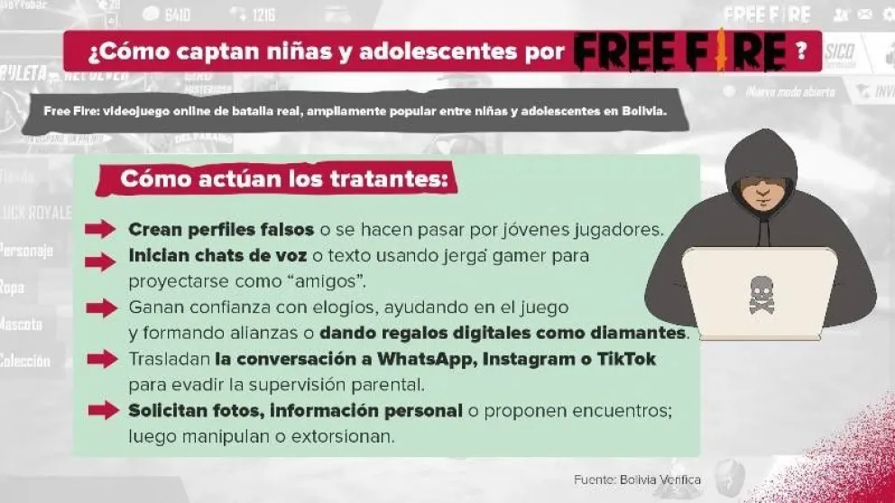 Israel Mariño, responsable del área de sistemas de la Fundación Munasim Kullakita, y Wara Delgadillo del Castillo, a cargo del Observatorio de Trata de Personas de Cecasem, coinciden en algo esencial: Free Fire no es el único terreno fértil para los tratantes.