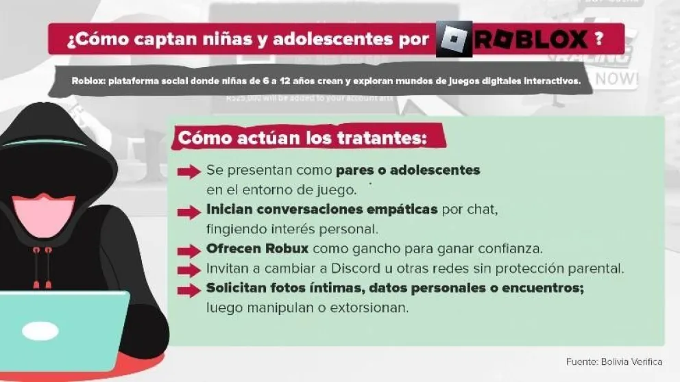 Y el problema no es exclusivo de Bolivia. En países como Estados Unidos ya se han reportado casos de trata y pornografía de niños que comenzaron con una simple conversación en Roblox, según informaron medios e instituciones internacionales como The Guardian, Fundación 5 Rights, NBC News, BBC Mundo y El País.