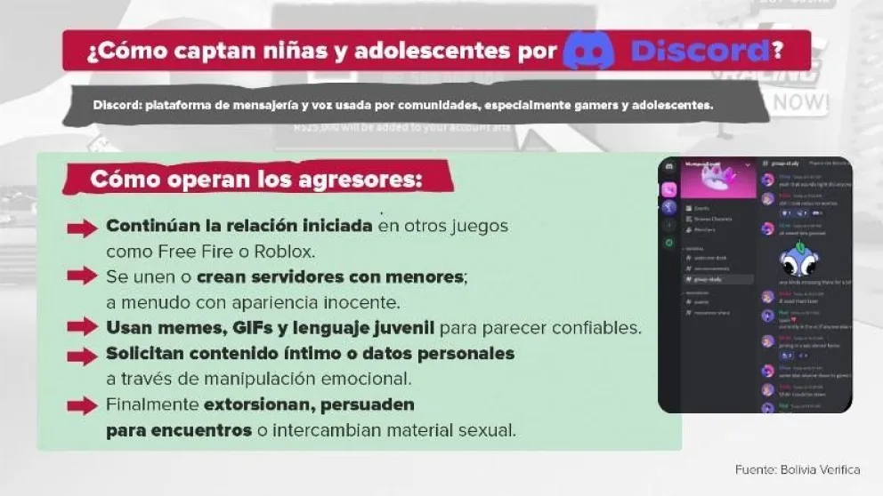 Sobre Discord, Mariño indica que funciona como una extensión del enganche inicial. Una vez ganada la confianza de la víctima en el videojuego, el tratante suele llevar la conversación a esta otra plataforma, donde el contacto es más directo, privado y prolongado.