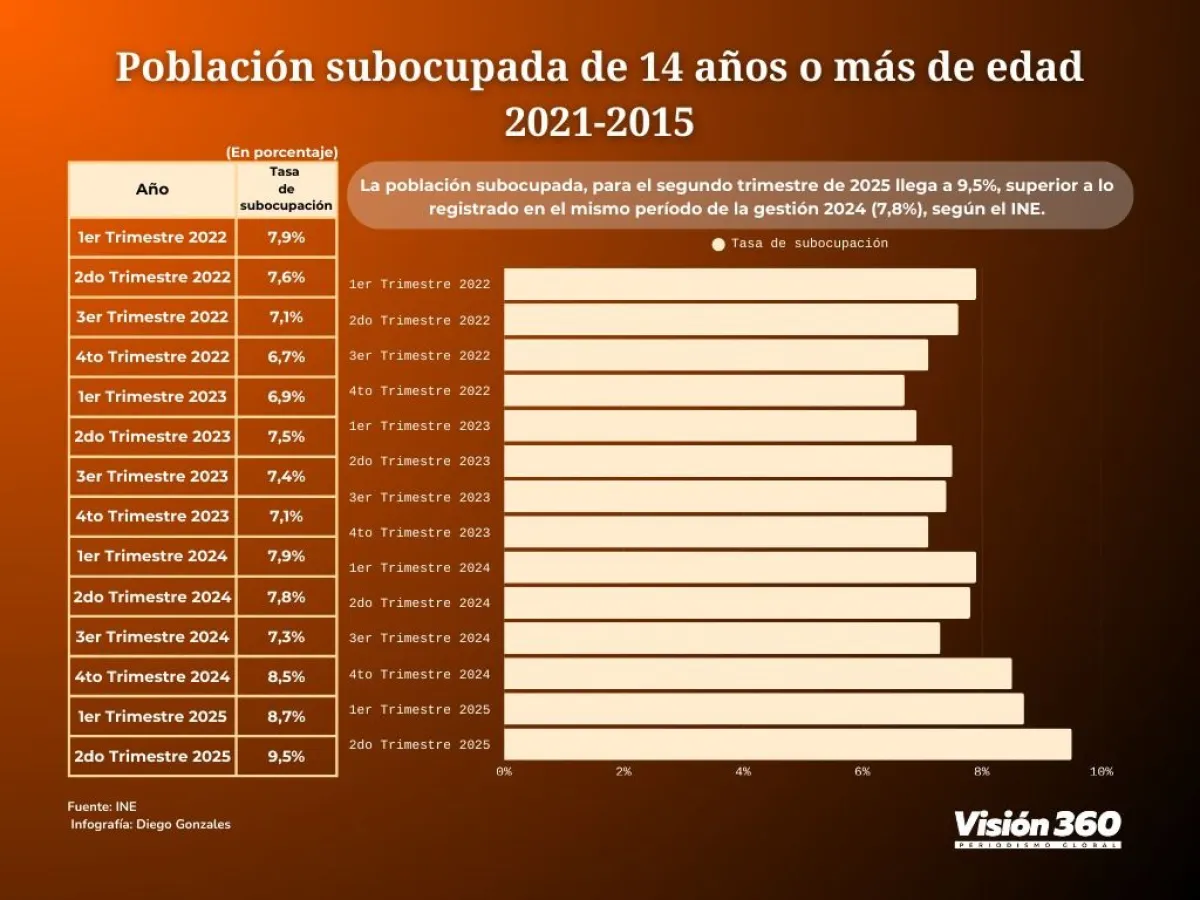 “La población subocupada, para el segundo trimestre de 2025 llega a 9,5%, superior a lo registrado en el mismo período de la gestión 2024 (7,8%)”, señala el reporte.