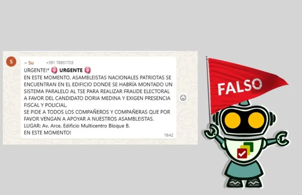 Con la amenaza de un presunto fraude está circulando una cadena en Telegram y WhatsApp en la cual se alerta que el equipo del candidato presidencial Samuel Doria Medina está montando un sistema paralelo de conteo de votos al que tiene el Tribunal Supremo Electoral (TSE); sin embargo, el contenido es engañoso. No se trata de un sistema paralelo de conteo de votos, sino del centro de monitoreo de la alianza Unidad.