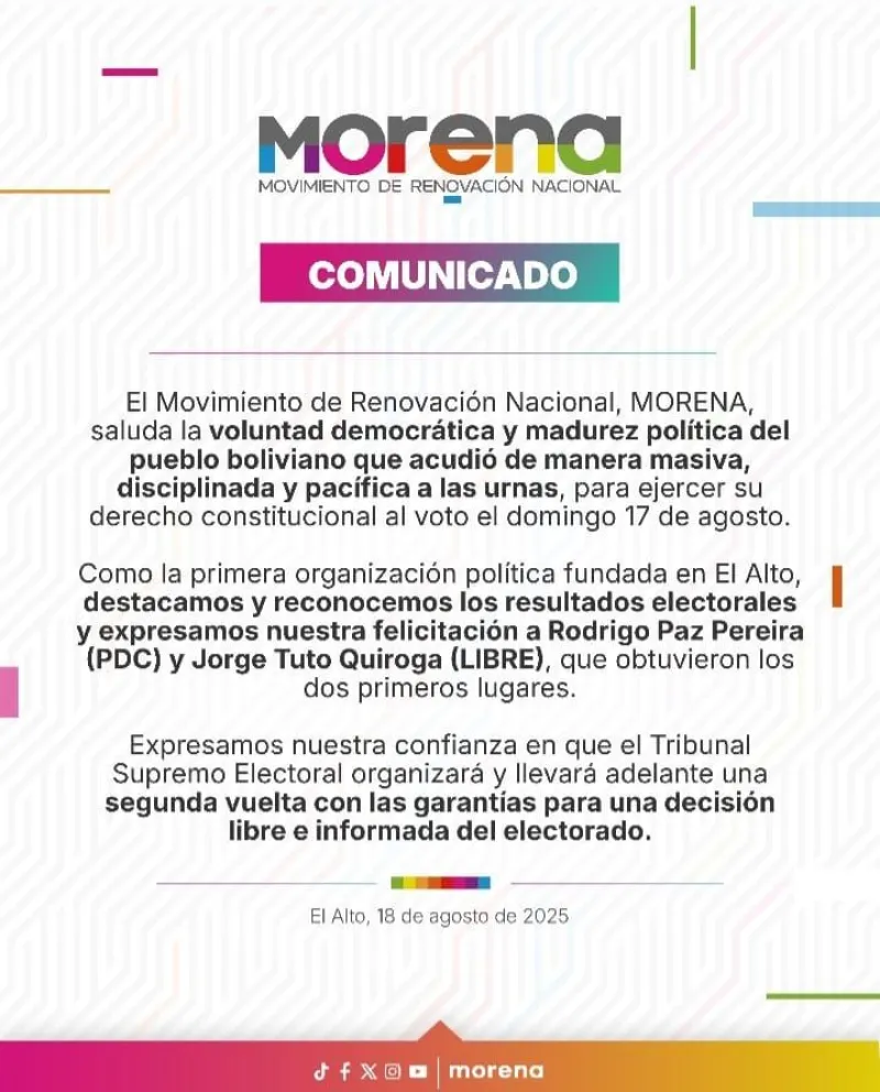 “Morena saluda la voluntad democrática y madurez política del pueblo boliviano que acudió de manera masiva, disciplinada y pacífica a las urnas, para ejercer su derecho constitucional al voto el domingo 17 de agosto”, indicó la organización en un pronunciamiento.