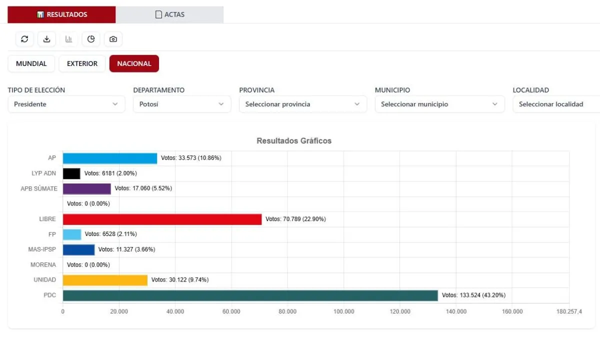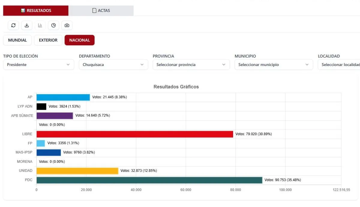 El conteo de votos de las elecciones del domingo fue completado este martes con el 100% de las actas electorales en Chuquisaca y Potosí, en ambos departamentos se impuso el candidato Rodrigo Paz, con el 35,5% y 43,2%, respectivamente.