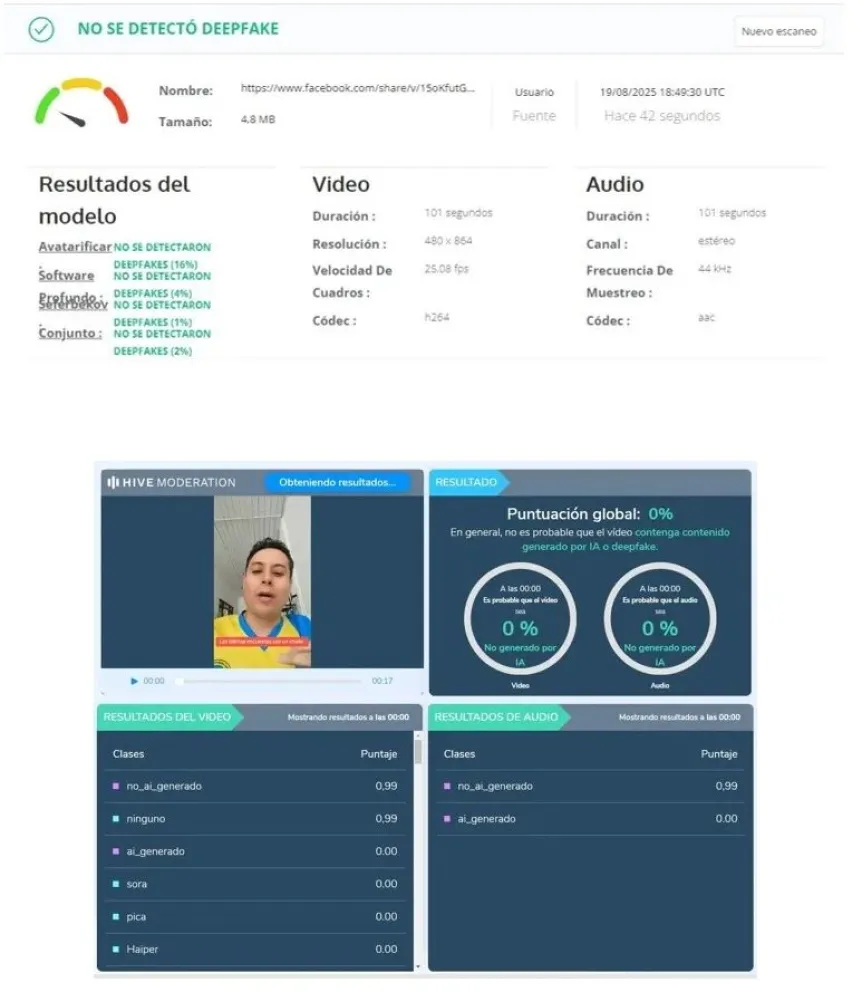 Un anlaísis realizado con dos herramientas de detección de IA permitió establecer que el video es auténtico, es decir que no fue fabricado ni manipulado. Las imágenes que se muestran a continuación dan cuenta de ello: