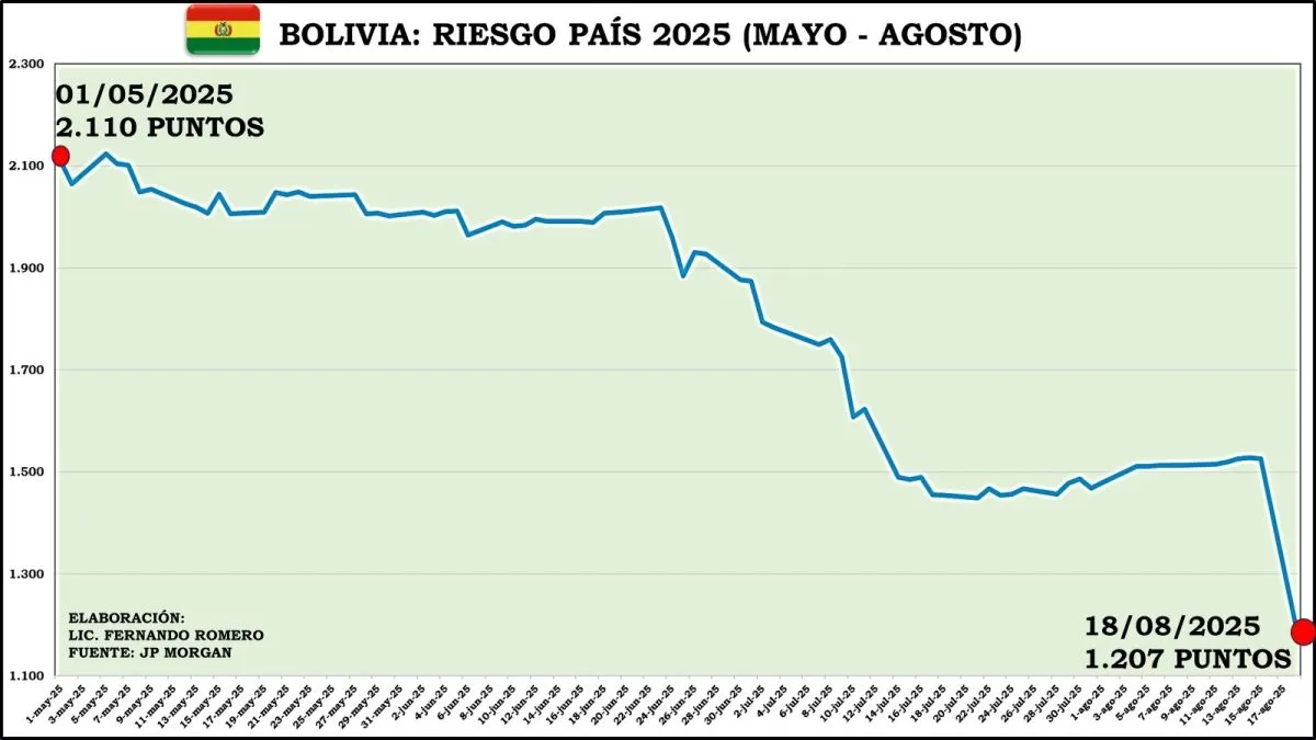 Recordó que el riesgo país de Bolivia, antes de las elecciones nacionales, el 15/08/2025, estaba por los 1.525 puntos. Un día después de los comicios electorales descendió en un 21%, es decir, llegó a 1.207 puntos, de acuerdo a los últimos datos obtenidos al 18 de agosto.