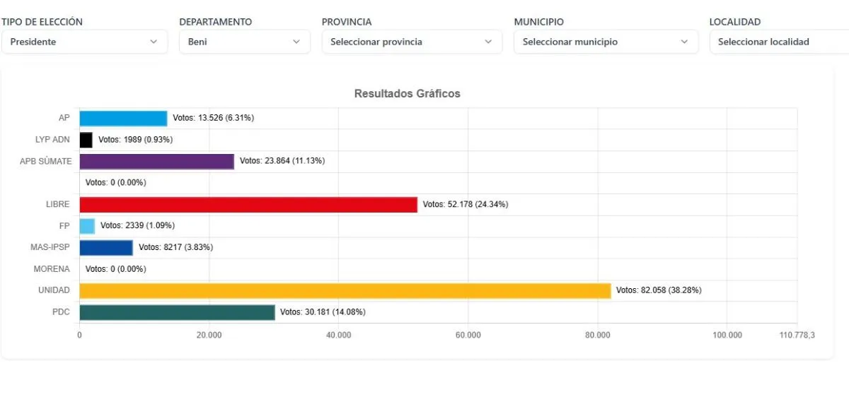 El cómputo final de actas de las elecciones del domingo 17 se cerró al 100% en Beni, donde se confirmó la victoria del candidato de Unidad, Samuel Doria Medina, con el 38,2% de votos. Luego se ubica Jorge Tuto Quiroga, con un 24,3%.