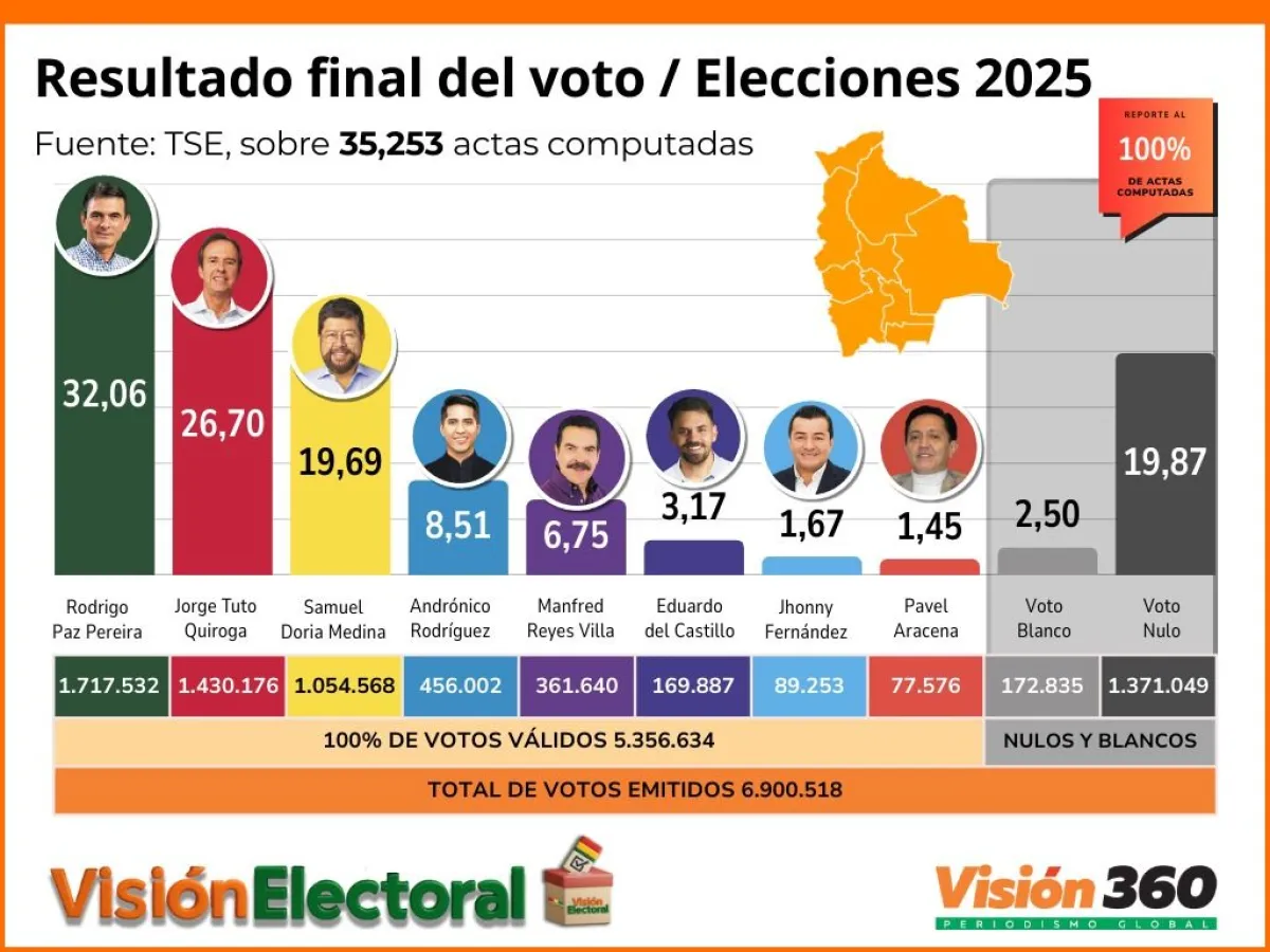 El Tribunal Supremo Electoral (TSE) finalizó el cómputo oficial de actas a nivel nacional y confirmó la segunda vuelta entre Rodrigo Paz, del Partido Demócrata Cristiano (PDC), y Jorge "Tuto" Quiroga, de la alianza Libre, que se llevará a cabo el 19 de octubre.