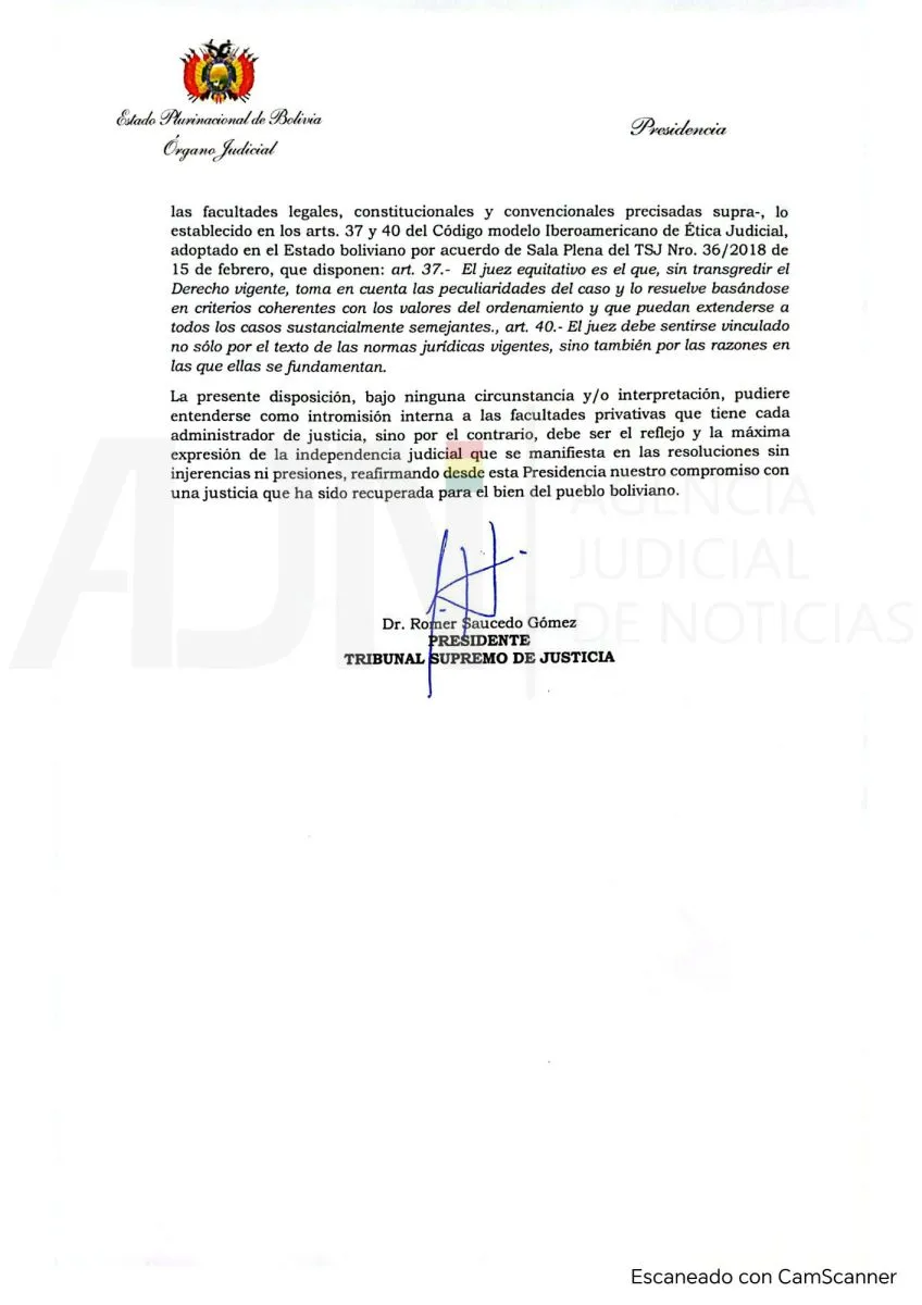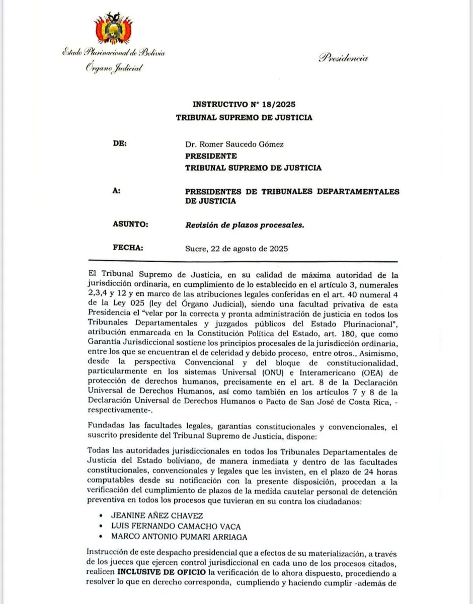 El Tribunal Supremo de Justicia (TSJ) emitió un instructivo para que todos los tribunales departamentales de justicia verifiquen el cumplimiento de plazos de la detención preventiva de la expresidenta Jeanine Añez, del gobernador de Santa Cruz, Luis Fernando Camacho y del dirigente cívico de Potosí, Marco Antonio Pumari, en todos los procesos en su contra.