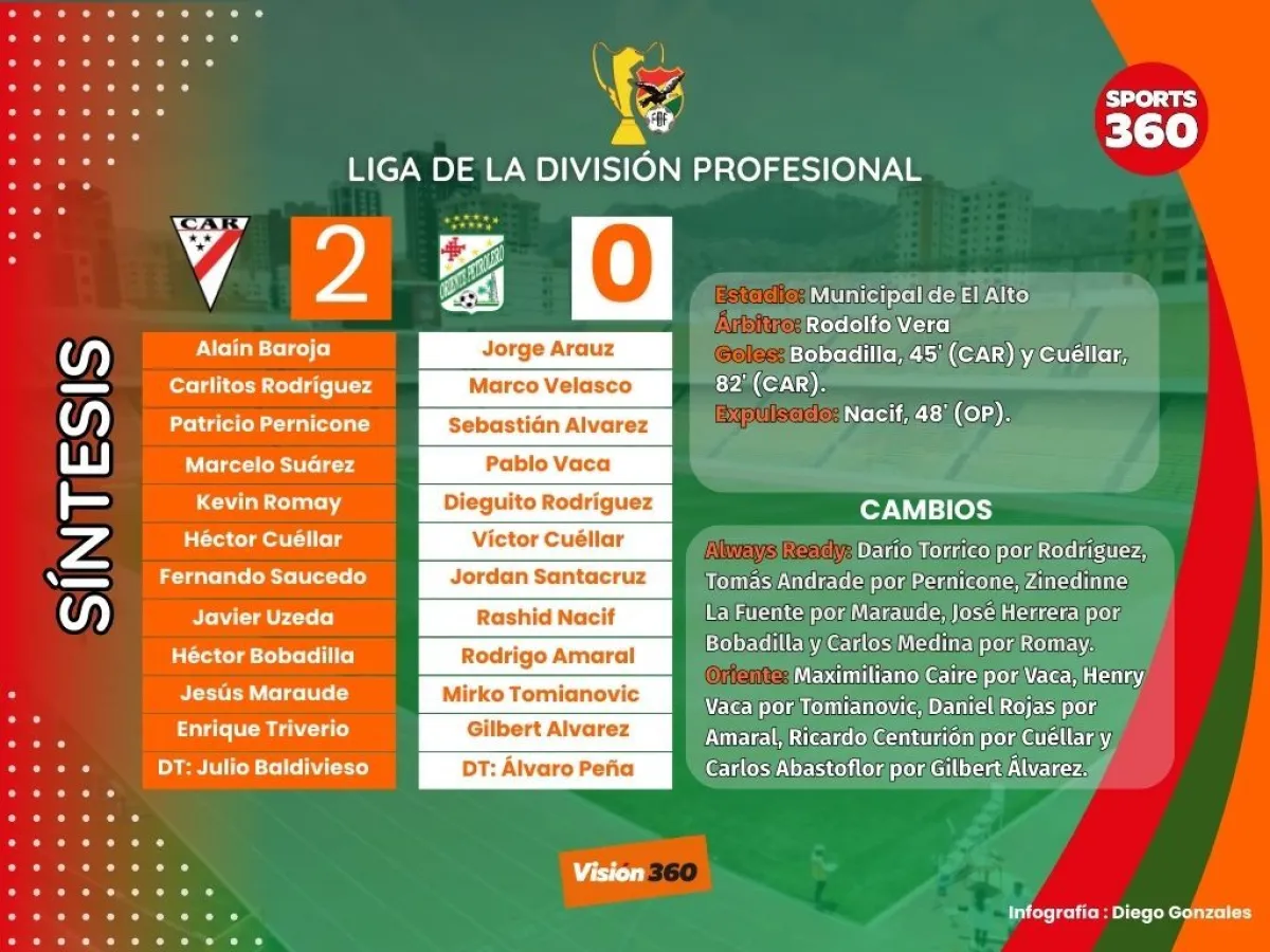 Always Ready venció por 2-0 a Oriente Petrolero y volvió a la cima del torneo Liga de la División Profesional, este viernes en el estadio Municipal de El Alto por el inicio de la decimoctava jornada del campeonato.