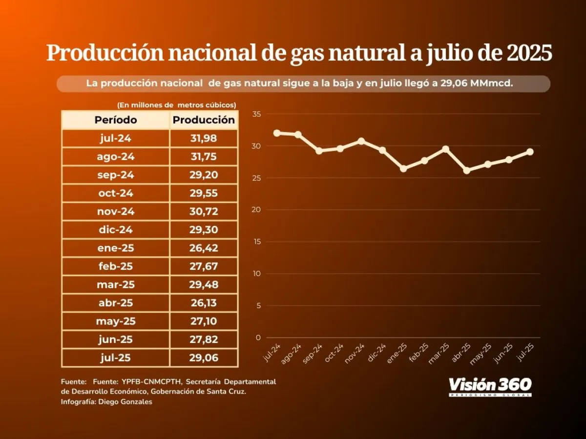 En 2014, la producción de gas natural llegó a 56,6 millones de metros cúbicos día (MMmcd), pero en 2024 cayó a 31,7 MMmcd y, este año, YPFB proyecta 29,5. A julio la oferta de los diferentes campos productores que están en declinación fue de 29,06 MMmcd, según datos oficiales.