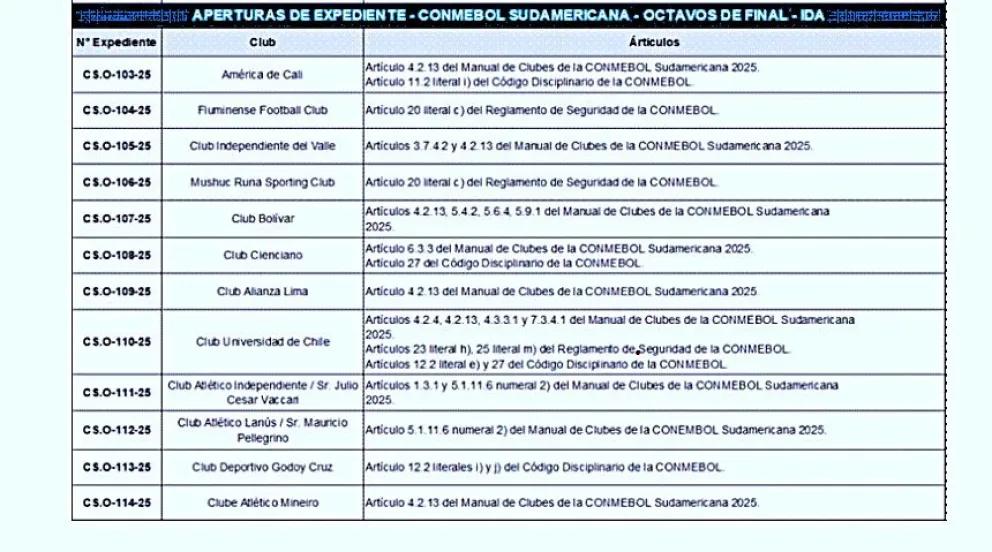 La Comisión Disciplinaria de la Conmebol le abrió un nuevo expediente al club Bolívar por haber incumplido en cuatro puntos del Manual de Clubes de la Copa Sudamericana, en el partido de ida que jugó el pasado 13 de agosto frente a Cienciano en el estadio Hernando Siles.