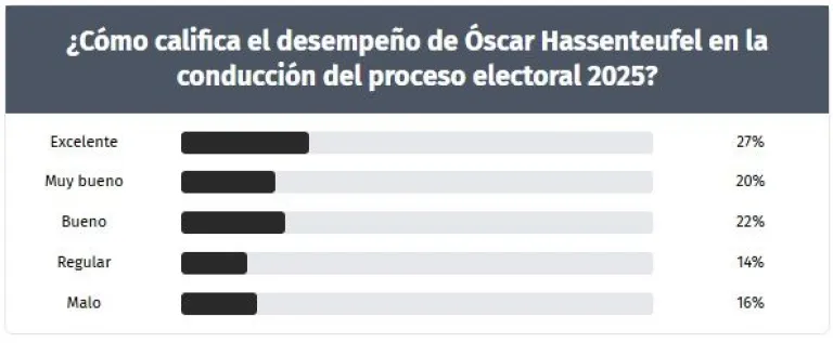 La pregunta fue ¿Cómo califica el desempeño de Óscar Hassenteufel en la conducción del proceso electoral 2025? Y se plantearon cinco opciones de respuesta: excelente, muy bueno, bueno, regular y malo.