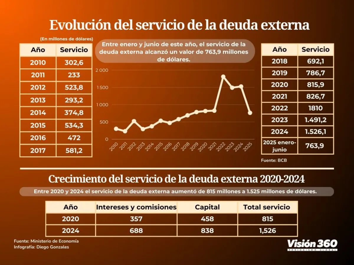 Al primer semestre del año, el servicio de la deuda externa alcanzó un valor de 763,9 millones de dólares, la mitad del segundo valor récord de 1.526,1 millones, que se tuvo que erogar el año pasado (datos del Banco Central de Bolivia BCB).