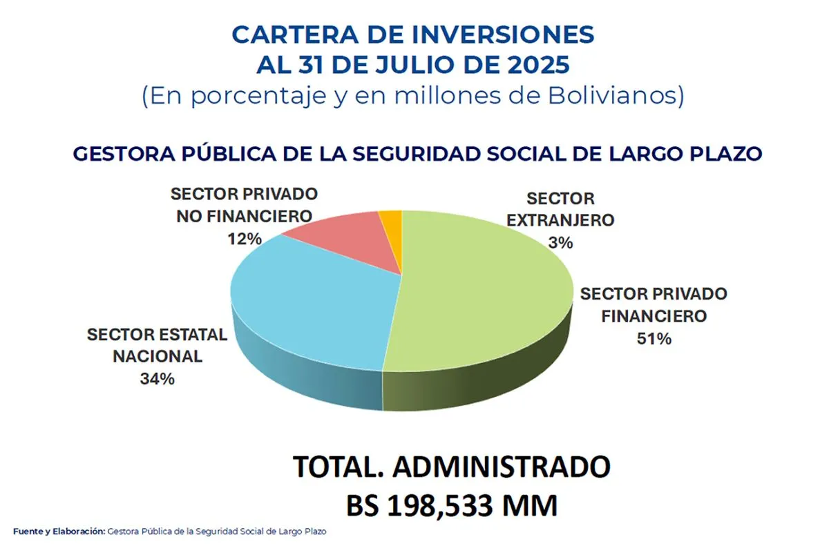 Según el balance realizado por el exgerente de la Gestora, Jaime Durán, antes de su renuncia, la entidad administra una cartera de inversiones con los fondos de pensiones de 198.533 millones de bolivianos. De ese valor, un 51% está colocado en el sector privado financiero, un 3% en el extranjero, un 34% en el sector estatal nacional y un 12% en el sector privado no financiero.
