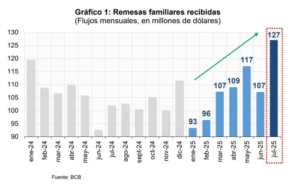 El Banco Central de Bolivia (BCB) informó este jueves que en siete meses las remesas suman 757 millones de dólares, lo que representa un aumento del 1,6% respecto al registro en el mismo periodo de 2024. El ente emisor indicó que en el mes de julio las remesas enviadas por los residentes bolivianos en el exterior sumaron 127 millones de dólares, lo que constituye el flujo mensual más alto desde el año 2024 (ver cuadro).