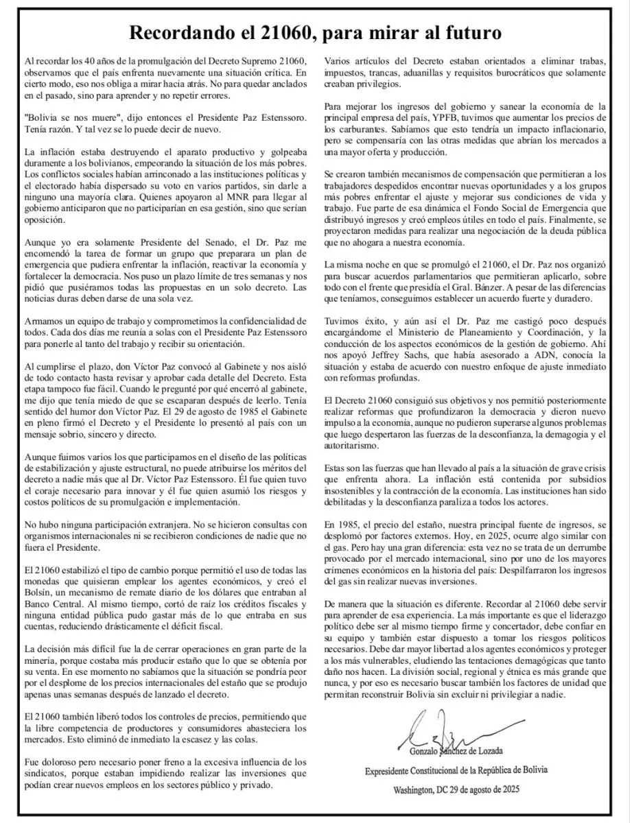 El expresidente Gonzalo Sánchez de Lozada (1993-1997 / 2002-2003), difundió una carta desde EEUU, donde radica desde 2003, y recordó los 40 años desde la promulgación del decreto supremo 21060 para estabilizar la economía del país y dijo que el Movimiento Al Socialismo (MAS) “despilfarró los ingresos del gas sin realizar nuevas inversiones”.