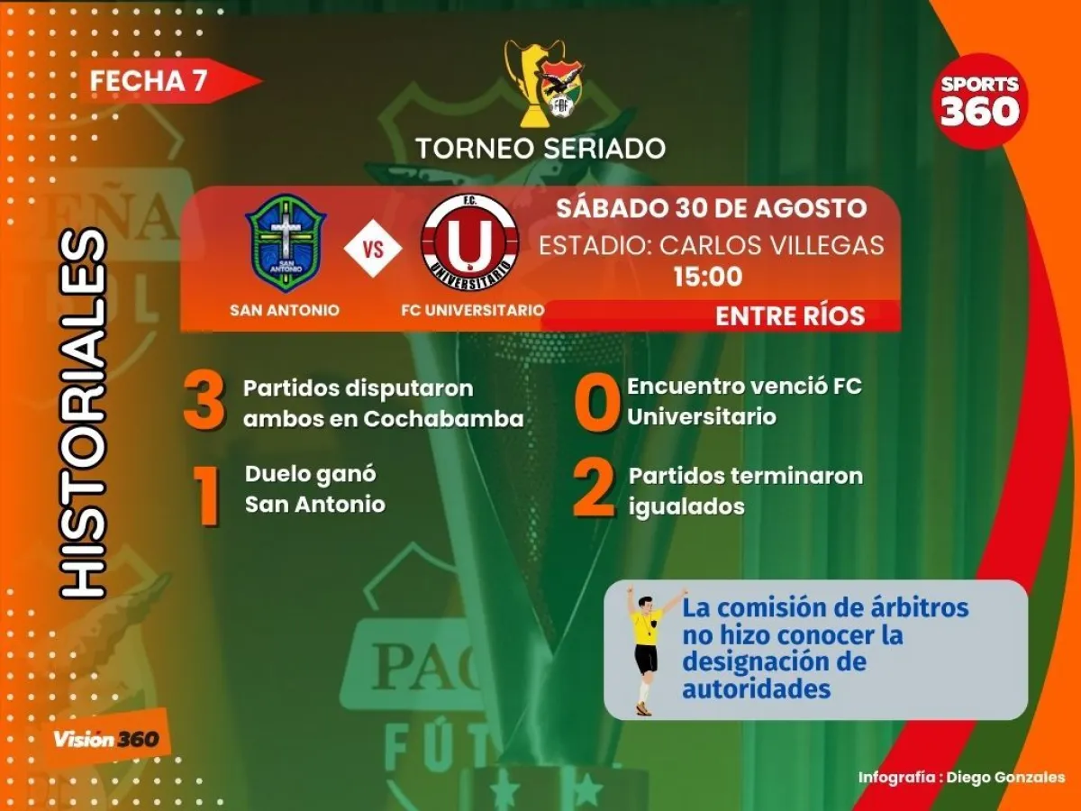 San Antonio y Universitario de Vinto jugarán esta tarde el único encuentro de este sábado (15:00), por la séptima fecha del torneo seriado, en el estadio Carlos Villegas de la localidad de Entre Ríos.