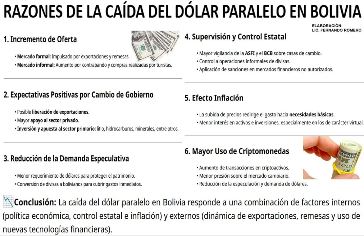 Según analiza el economista Fernando Romero, presidente del Colegio de Economistas de Tarija, las principales causas de la caída del dólar paralelo en Bolivia en los últimos meses responden a una combinación de factores internos (política económica, control estatal e inflación, y externos, como la dinámica de las exportaciones, remesas y uso de nuevas tecnologías financieras.