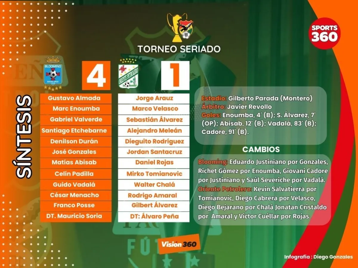 Blooming mantuvo la supremacía que tiene sobre Oriente Petrolero en los clásicos cruceños —no pierde desde 2022—, lo goleó por 4 a 1 en la tarde-noche de este domingo, en partido de la séptima jornada de la Copa de la División Profesional.