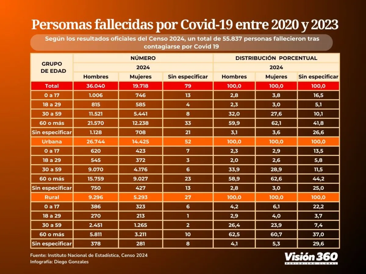 A nivel urbano se declaró un total de 26.744 varones y 14.425 mujeres que perdieron la vida por covid-19 y no se detalló a 52 personas y en el área rural se registró a 9.296 personas fallecidas varones y 5.293 mujeres y 27 no se especificó.