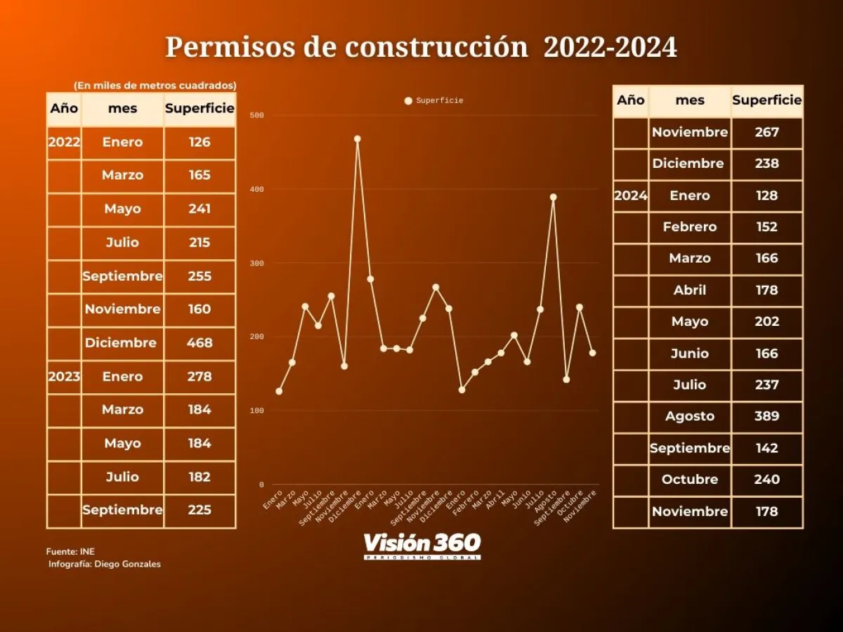 En junio de 2023 se tenían 214 mil metros cuadrados de superficie autorizada para construcciones residenciales y no residenciales en ciudades capitales y principales conurbaciones.
