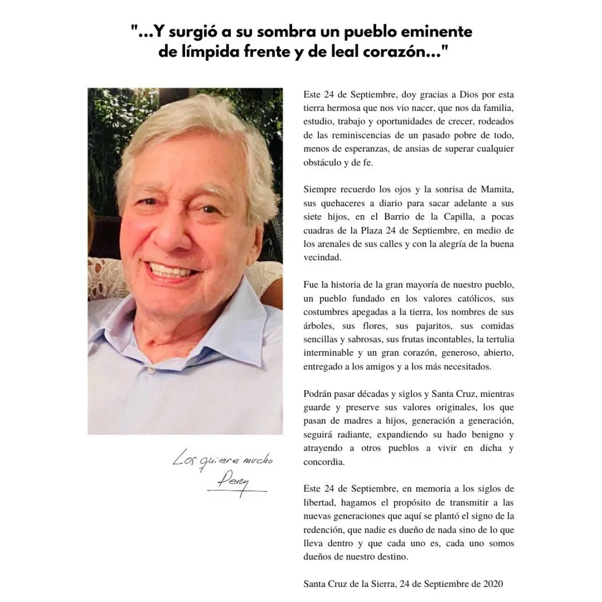 En ella, publica El Deber, resalta que tuvo ·"el privilegio de trabajar junto a un hombre grande, no solo por la magnitud de sus obras, sino por la grandeza de su amor a Santa Cruz y a su gente. Usted fue, es y será siempre el mejor alcalde que pudo tener nuestra tierra: un hombre sabio, humilde, lleno de consejos y, sobre todo, rebosante de amor por cada vecino y cada vecina".