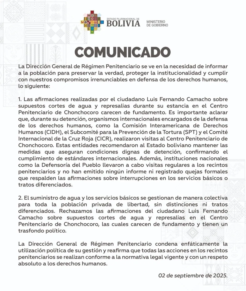 “Las afirmaciones realizadas por el ciudadano Luis Fernando Camacho sobre supuestos cortes de agua y represalias durante su estancia en el Centro Penitenciario de Chonchocoro carecen de fundamento”, dice el pronunciamiento.