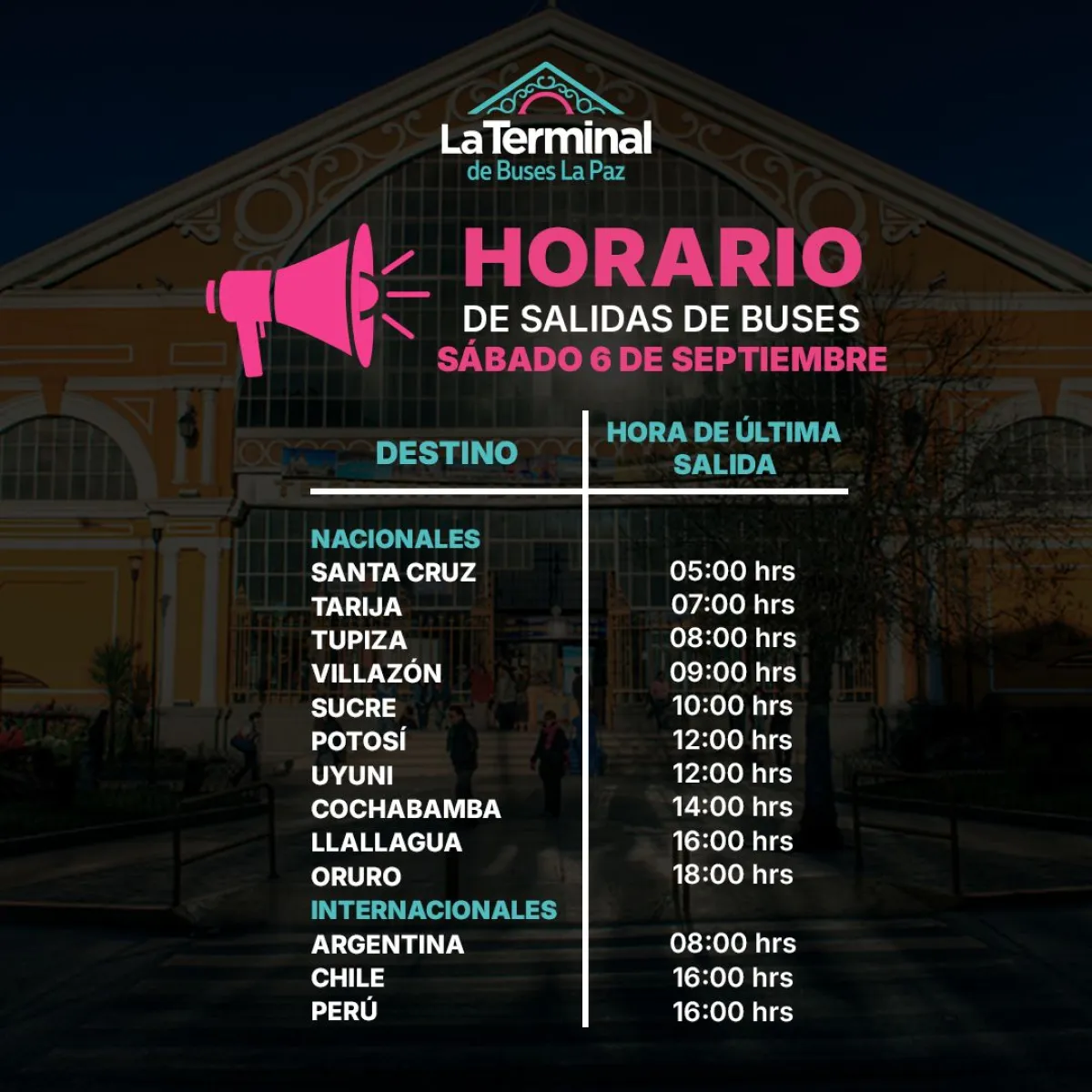 A la ciudad de Sucre el último bus saldrá a las 10:00 de este sábado, y a Potosí y Uyuni los buses saldrán de la terminal paceña a mediodía (12:00). El último bus que parta a Cochabamba saldrá a las 14:00, a Llallagua a las 16:00 y a Oruro a las 18:00.