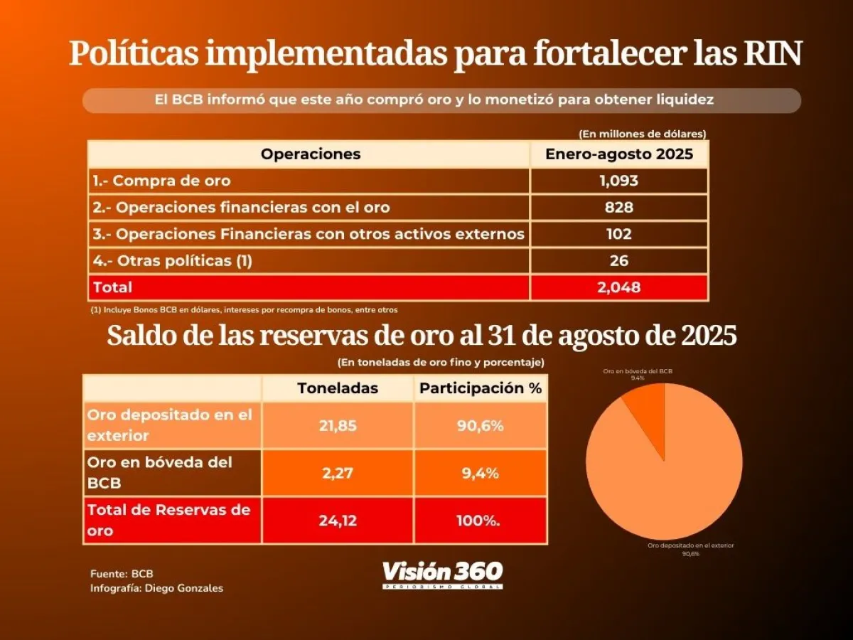Entre enero y agosto el BCB compró 9,87 toneladas de oro por valor de $us 1.093 millones y realizó operaciones financieras con oro por $us 828 millones. La entidad asegura que se mantiene un nivel de 24,12 toneladas de oro fino como reservas, superior a las 22 toneladas que dispone como mínimo la Ley 1503.