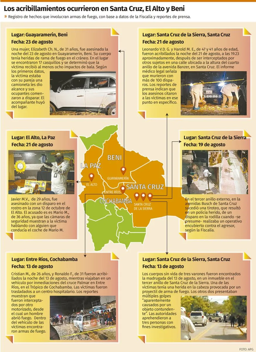 Pero, pese a las similitudes, los asesinatos en Beni, en La Paz y el ataque en Cochabamba no tienen mayores elementos en común fuera de la modalidad.