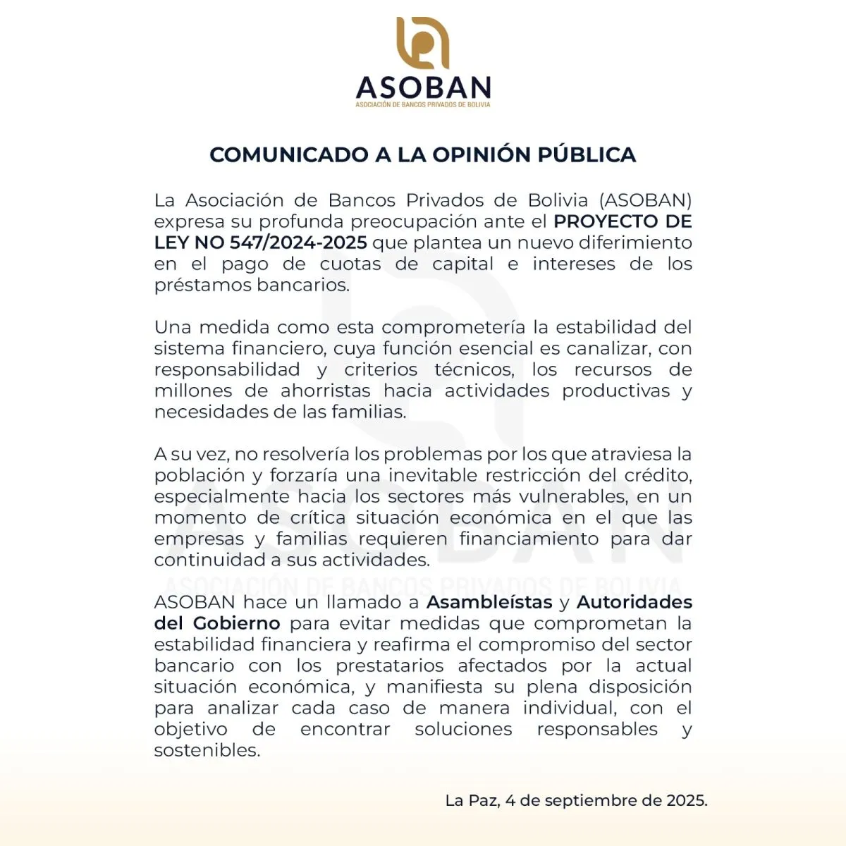 A través de un comunicado, la Asociación de Bancos Privados de Bolivia (Asoban) expresó su preocupación con relación al proyecto de ley que plantea un diferimiento de créditos. Advirtió que la medida “compromete la estabilidad” del sistema financiero y aseguró que la misma “no resolverá los problemas que atraviesa la población”.