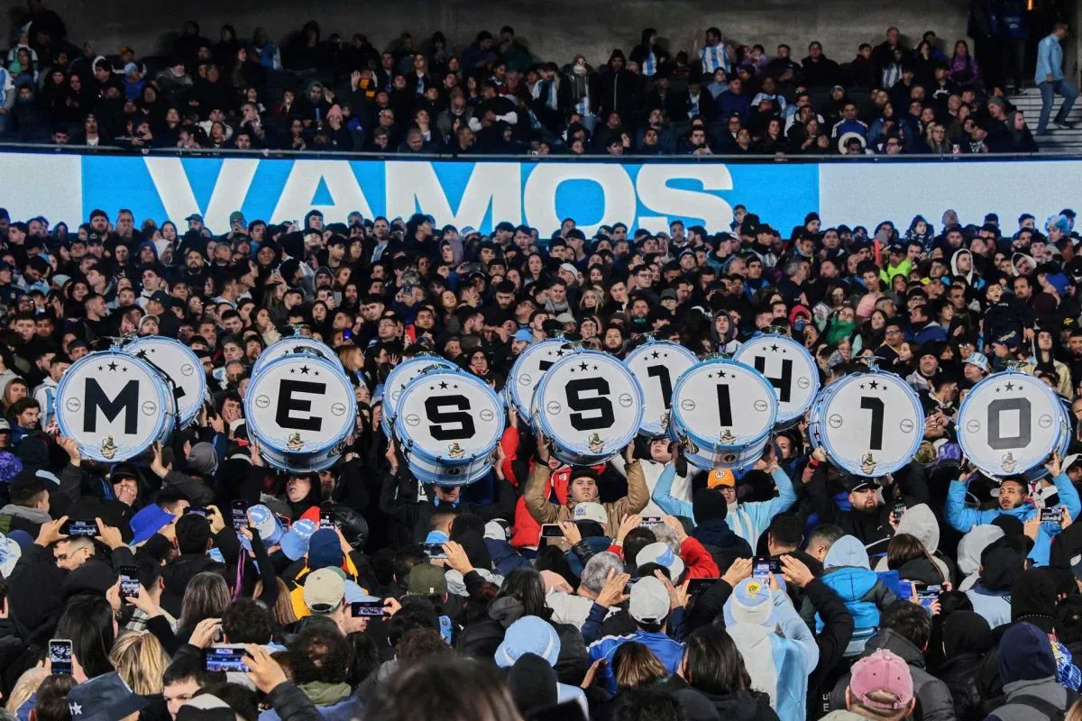 Aficionados argentinos levantan tambores con las iniciales del nombre de Lionel Messi, previo al partido ante Venezuela. Foto: EFE