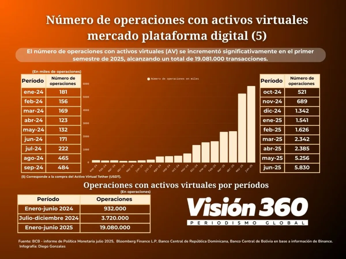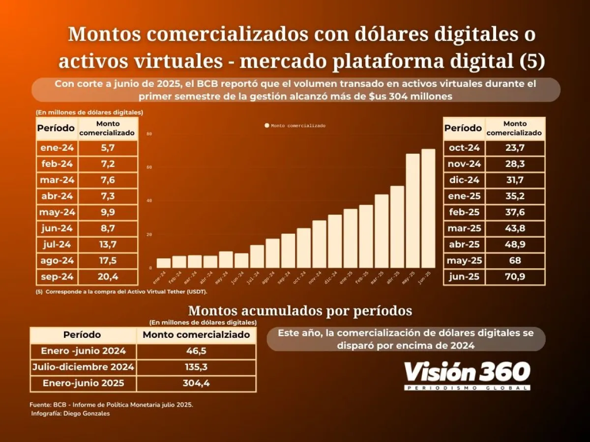 “Con corte a junio de 2025, el BCB reportó que el volumen transado en AV  (activos virtuales) durante el primer semestre de la gestión alcanzó más de 304 millones de dólares. Esta cifra fue significativamente superior a los 46,5 millones de dólares registrados en el primer semestre de 2024, previo a la emisión de la nueva normativa”, precisa el reporte.