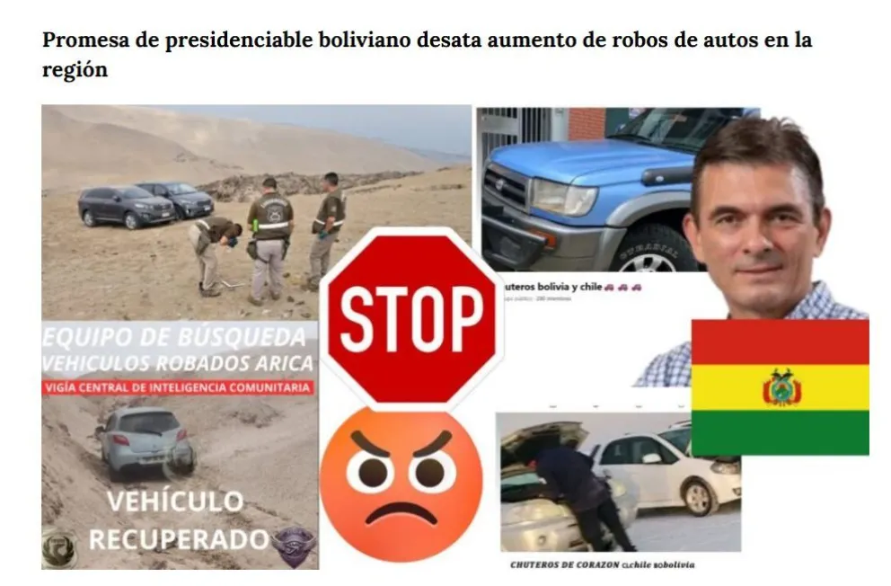 “¡Atención con el aumento en los robos de vehículos! Definitivamente, la promesa del candidato presidencial boliviano Rodrigo Paz de regularizar los autos robados, desató un ‘efecto llamada’ en la ciudad (Arica), al punto que en la semana 33 hubo un incremento de 185,7% según el Sistema Táctico de Operación Policial (STOP) en este delito, registrándose hasta ocho robos por día”, publicó el medio chileno El Mostrador.