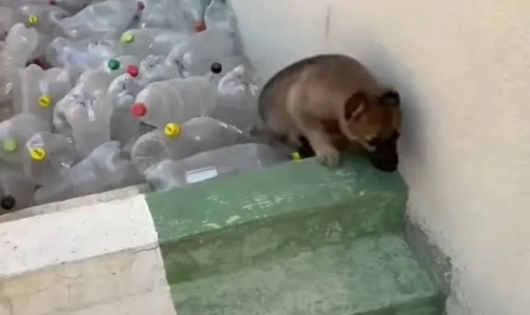 Un pequeño pastor alemán sortea una piscina de botellas. Foto: Captura CIOC K9