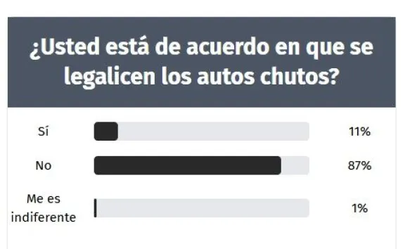 Un sondeo de opinión realizado por Visión 360 para conocer la opinión de sus lectores en torno a la legalización de autos indocumentados (chutos) dio como resultado que el 87% de ellos rechaza esta posibilidad, mientras que el 11% la respalda. El 1% respondió que le es indiferente.