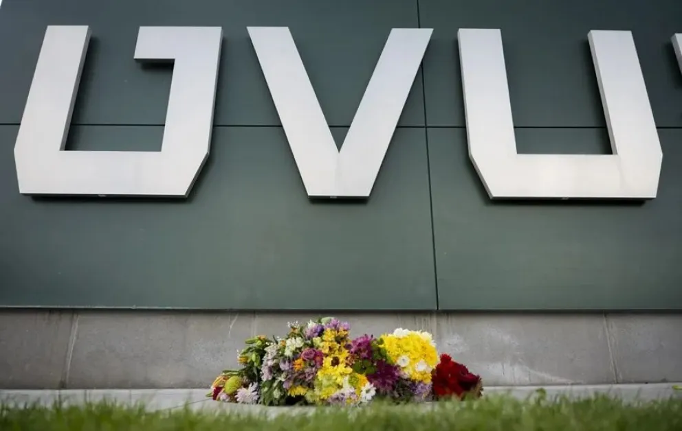 Flores depositadas en la entrada de la Universidad del Valle de Utah, tras el asesinato de Charlie Kirk.