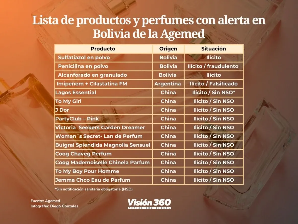 La Agencia Estatal de Medicamentos y Tecnologías en Salud (Agemed) entre el 1 y 8 de septiembre público una lista de al menos 15 productos y perfumes que se comercializan de forma ilícita en Bolivia y emitió la alerta nacional correspondiente. La mayoría provienen principalmente de China.