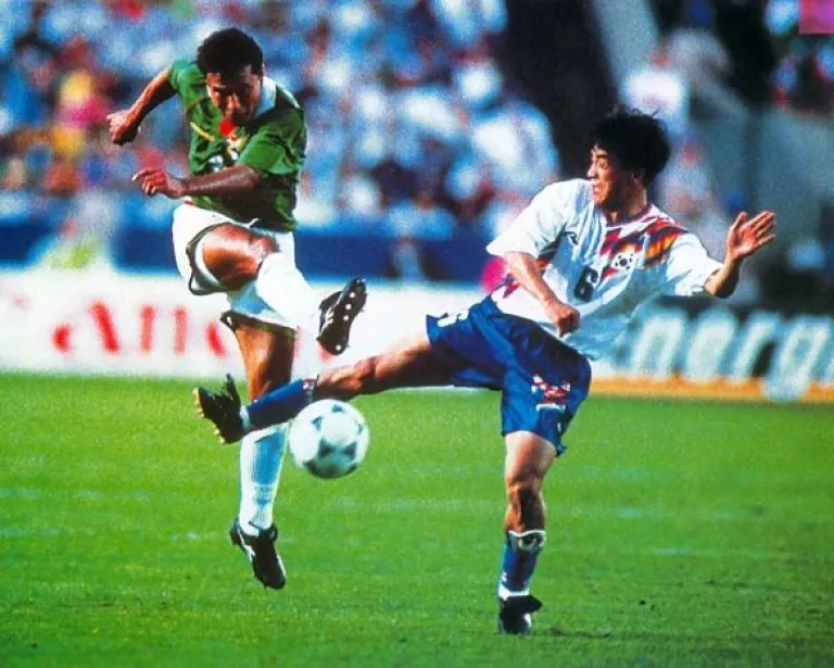 Marco Sandy patea la pelota ante Corea del Sur en el Mundial de 1994. Foto: Historia del Fútbol Boliviano.