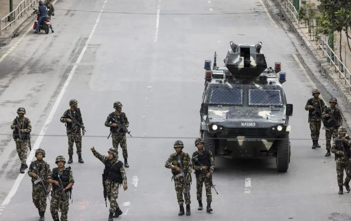 Soldados del Ejército nepalí patrullan una zona en Kathmandu.