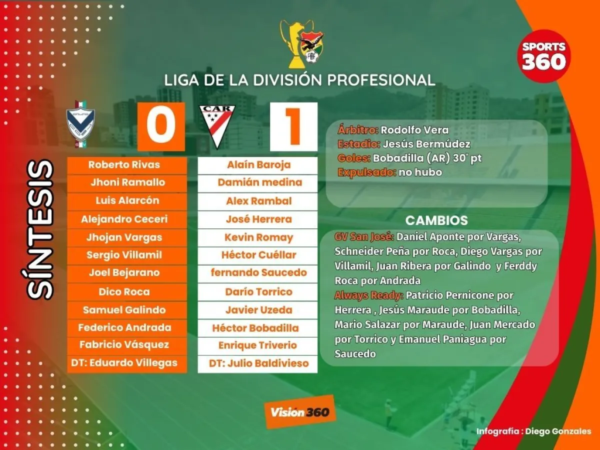 Always Ready vuelve a la punta del torneo todos contra todos luego de imponerse esta noche a GV San José (1-0), en partido que se disputó en el estadio Jesús Bermúdez.