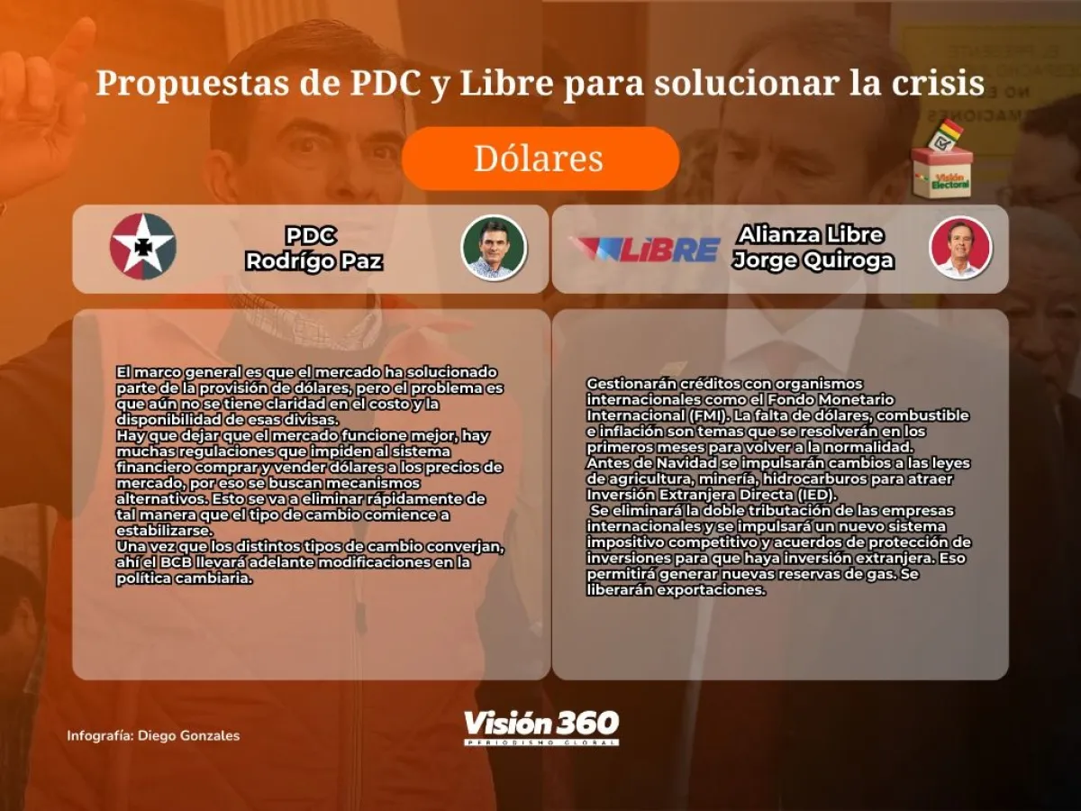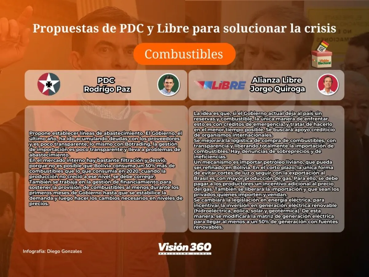 Una comparación de seis propuestas de ambas fuerzas (provisión de combustibles, subvención, hidrocarburos, litio, dólares y déficit) da cuenta de que hay ajustes en las ofertas del PDC, en las que se detectan profundización y ciertas incorporaciones (en Libre, en todo su programa, se identifican algunas adiciones).