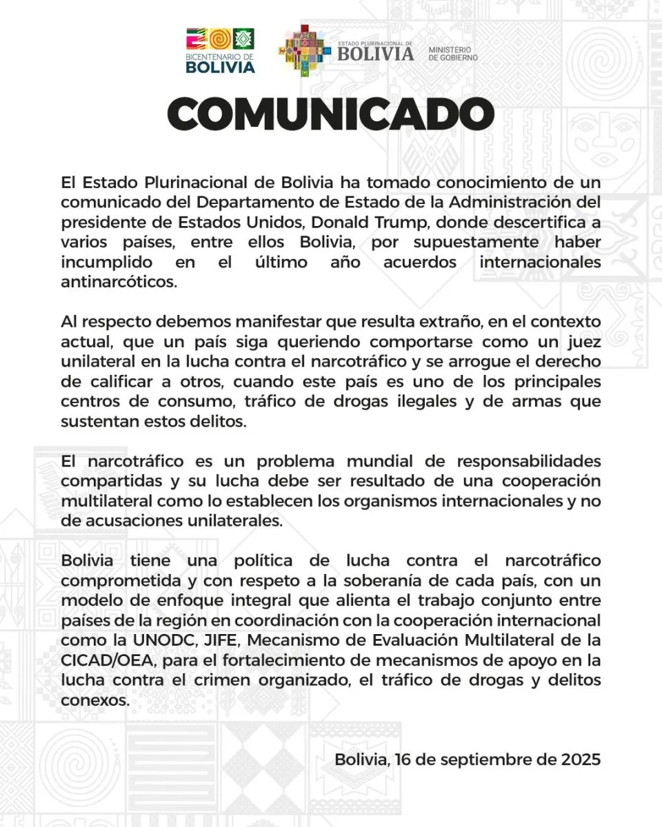 El texto señala que el Estado Plurinacional de Bolivia "ha tomado conocimiento de un comunicado del Departamento de Estado de la Administración del presidente de Estados Unidos, Donald Trump, donde descertifica a varios países, entre ellos Bolivia, por supuestamente haber incumplido en el último año acuerdos antinarcóticos internacionales”.