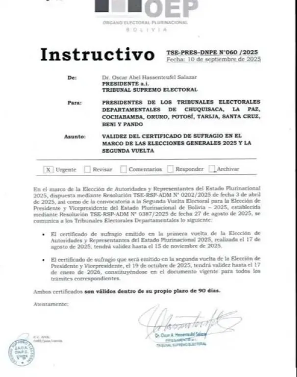 “El certificado de sufragio emitido en la primera vuelta de la Elección de Autoridades y Representantes del Estado Plurinacional 2025, realizada el 17 de agosto de 2025, tendrá validez hasta el 15 de noviembre de 2025. (...) El certificado de sufragio que será emitido en la segunda vuelta de la Elección de Presidente y Vicepresidente, el 19 de octubre de 2025, tendrá validez hasta el 17 de enero de 2026, constituyéndose en el documento vigente para todos los trámites correspondientes”, establece el instructivo.