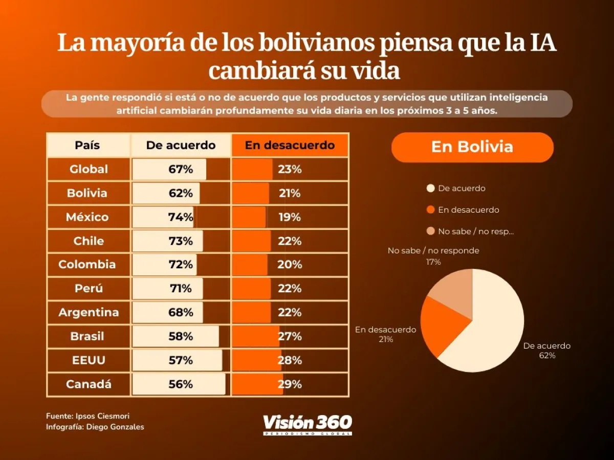 La mayoría de la población (62%) en Bolivia, piensa que los productos y servicios que utilizan inteligencia artificial cambiarán profundamente su vida diaria en los próximos tres a cinco, según revela un nuevo estudio de Ipsos Ciesmori sobre “Percepciones sobre la Inteligencia Artificial”.